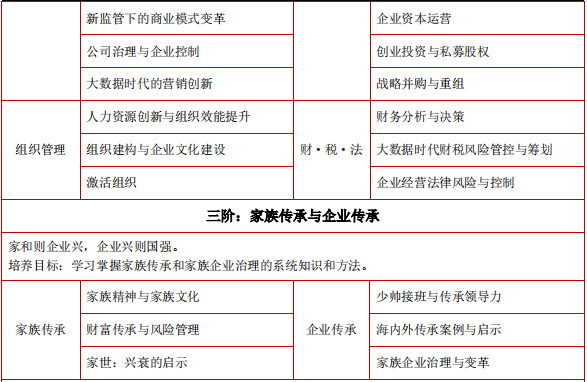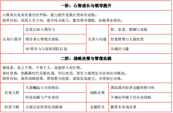 引入西方在管理学、心理学、脑科学及商科教育领域的研究成果,与中国文化相 融合,采用“基于核心知识体系和中国企业实际的问题导向式”课程设计,有针 对性的培养学员拥有一种全新的思维方式,更有力的驾驭企业和应对环境。